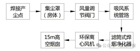 焊接點(diǎn) →半封閉房體 → 吸風(fēng)管路 →濾筒式焊煙凈化器 → 風(fēng)機(jī) → 煙囪(室外鋼平臺支撐)